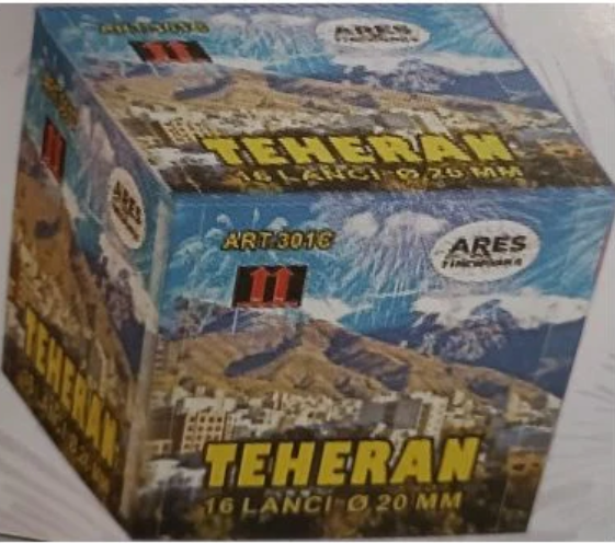 La TEHERAN è una batteria composta da 16 lanci pensata per offrire uno spettacolo pirotecnico deciso e luminoso, con contrasti cromatici intensi ed effetti brillanti. Classificata in categoria F2 CE (T.U.L.P.S. V gruppo “C”), è destinata a un utilizzo responsabile in ambito privato, nel rispetto delle normative vigenti.